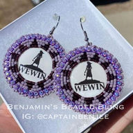 Part of the Beetlejuice collection, these purple earrings feature a quote from Lydia Deetz on a high grade wood center. They are roughly 2" around and were made size 10 and 11 seed beads, ss8 banding, wire guard, earring hooks and backed with light tan leather. SOLD for $42.